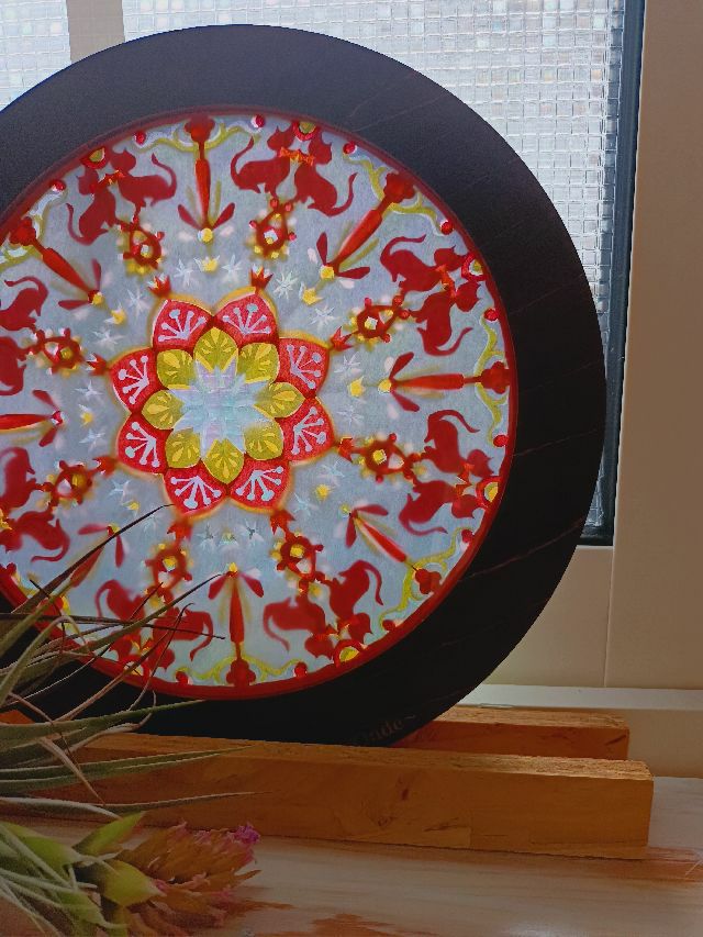 ローズウィンドウ切り絵「仲良しネコのローズウィンドウ」です。ネコのいるかわいいらしい世界観を切り絵で表現しています。光が差し込むときれいです。窓辺に飾ってください。