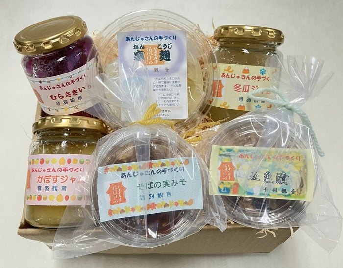 まごころ便はジャムなどのビンは約3点、寒麹、パック入り味噌などから3点。住職、潤子さんが作った何が入っているかお楽しみの商品です。