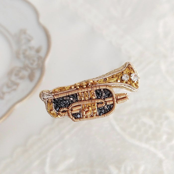この身に着けやすい大きさで、ここまで細工が細かく、デザインも限りなく美しいのは手嶋先生ならでは。高さの厚みもしっかりあって、サイドからは切りっぱなしではなく銀の美しいコードが縁取りされているのも高級感があります。おススメですよ!