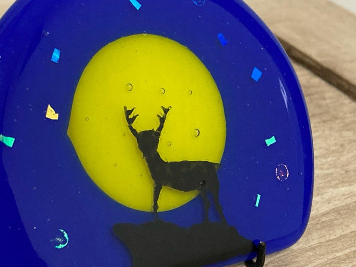 ステンドグラス作家・工芸家「創作ステンドグラス工房・ビッグハウス」の大家 伸介さん製作の鹿デザインの半円パネルです。